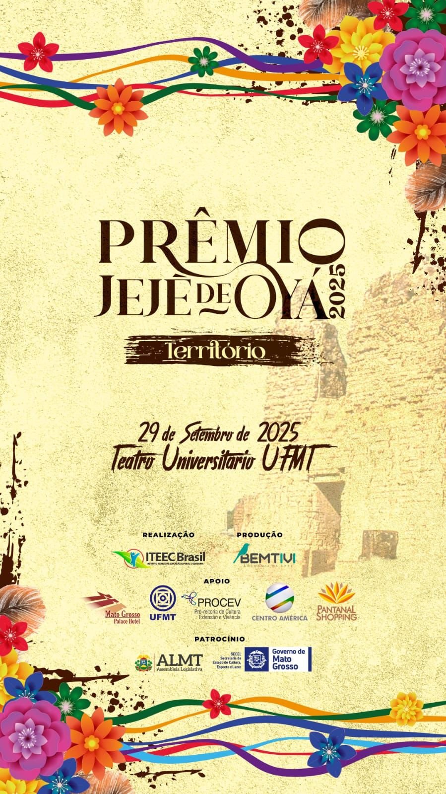 A 4ª edição do Prêmio Jejé de Oyá será realizada no dia 29 de setembro de 2025, no Teatro Universitário da UFMT, em Cuiabá. Consolidado como uma das mais importantes iniciativas de valorização da cultura, da memória e do protagonismo negro em Mato Grosso, o prêmio traz neste ano o tema “Território”.