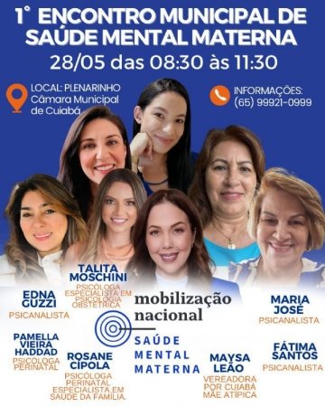 A Câmara Municipal de Cuiabá sedia, no próximo dia 28 de maio de 2025, o 1º Encontro Municipal de Saúde Mental Materna. O evento gratuito é uma iniciativa da vereadora Maysa Leão, em parceria com o Movimento Nacional da Saúde Materna de Cuiabá, e será realizado das 8h30 às 11h30, no auditório Plenarinho da Casa de Leis.