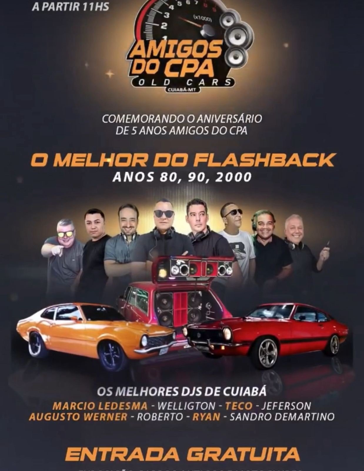 Cuiabá vai parar neste sábado. Venha reviver memórias, celebrar a paixão pelos carros antigos e dançar ao som dos maiores hits do flashback!