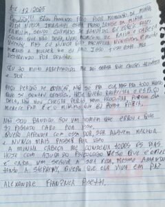 A carta foi anexada ao processo pelo advogado de defesa e integra um pedido de habeas corpus protocolado no Tribunal de Justiça de Mato Grosso (TJMT). O histórico criminal de Alexandre inclui, ainda, um processo de 2018 por perseguição e ameaças contra outra ex-namorada.