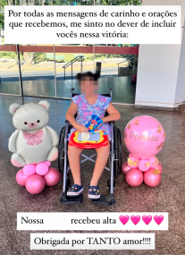 A alta médica foi comunicada pela irmã mais velha em rede social. Na mensagem, a jovem agradeceu as mensagens de carinho e orações pela recuperação da caçula, agradeceu à equipe médica do hospital particular em que ela estava internada e aos do hospital São Lucas, em Lucas do Rio Verde, onde a pequena recebeu os primeiros atendimentos.